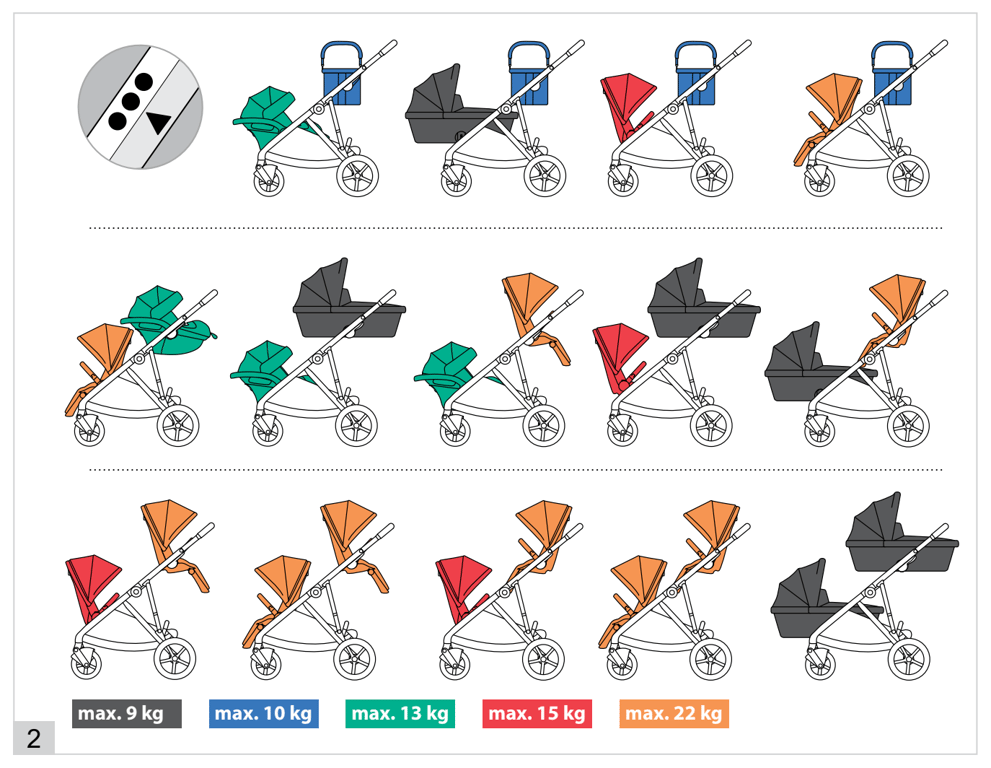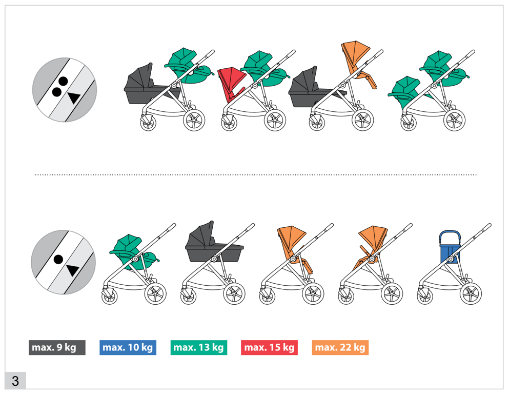 ** Now let's talk about the weight capacity regarding the double seat setup. I see a lot of desinformative article about the Gazelle, so let's make it clear, right from the Gazelle manuals. Cybex made a very clear infographic about what is the max capacity of the different setups.