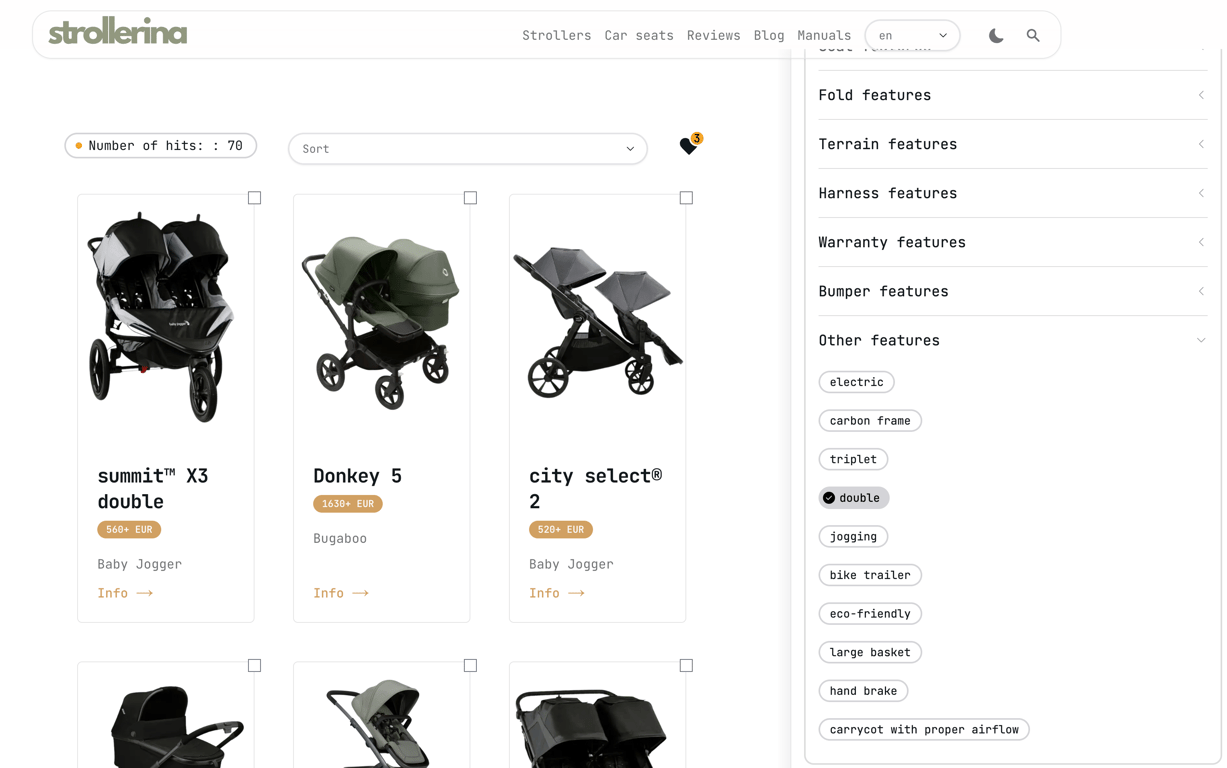A strollerina.com oldalon szűrhetsz a dupla babakocsik között, ahogy az a képen látható.